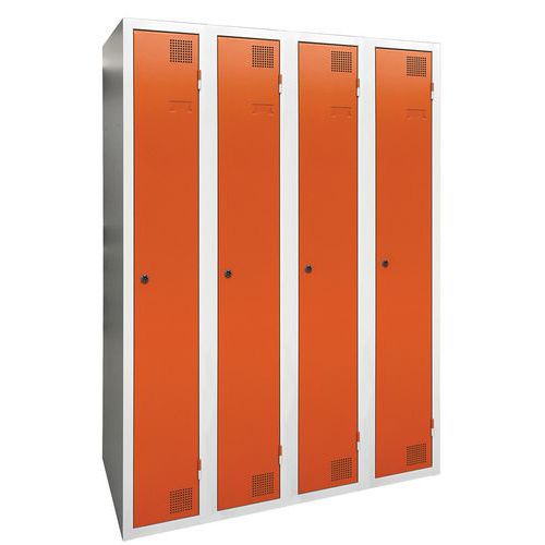 Cacifo com secagem com ar quente pulsado, de grande resistência, com compartimentos e cabides. Corpo e porta em chapa eletrozincada, com ómega de reforço a toda a altura. Utilização confortável com sistema de dobradiças que oferecem uma abertura a 180°. Higiénico, com dupla ventilação na frente, na parte superior e na parte inferior do cacifo. Acabamento elegante em tinta epóxi lacada, numa grande palete de cores atraentes. 2 fechos à escolha: fechadura com chave ou fecho porta-cadeado. Cacifo com porta-etiquetas. Produto fabricado em França.