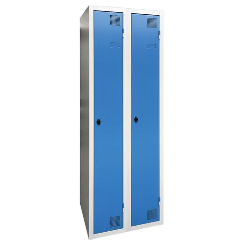 Cacifo com secagem com ar quente pulsado, de grande resistência, com compartimentos e cabides. Corpo e porta em chapa eletrozincada, com ómega de reforço a toda a altura. Utilização confortável com sistema de dobradiças que oferecem uma abertura a 180°. Higiénico, com dupla ventilação na frente, na parte superior e na parte inferior do cacifo. Acabamento elegante em tinta epóxi lacada, numa grande palete de cores atraentes. 2 fechos à escolha: fechadura com chave ou fecho porta-cadeado. Cacifo com porta-etiquetas. Produto fabricado em França.