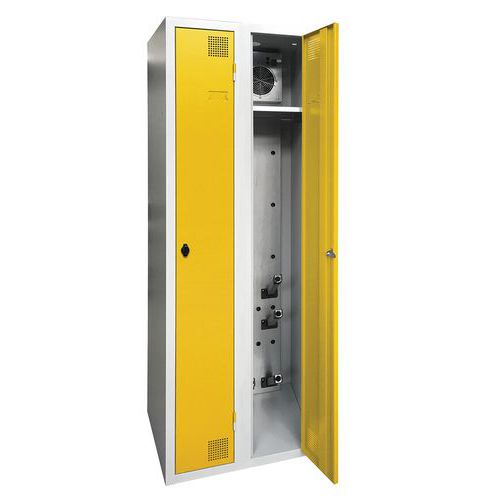 Cacifo com secagem com ar quente pulsado, de grande resistência, com compartimentos e cabides. Corpo e porta em chapa eletrozincada, com ómega de reforço a toda a altura. Utilização confortável com sistema de dobradiças que oferecem uma abertura a 180°. Higiénico, com dupla ventilação na frente, na parte superior e na parte inferior do cacifo. Acabamento elegante em tinta epóxi lacada, numa grande palete de cores atraentes. 2 fechos à escolha: fechadura com chave ou fecho porta-cadeado. Cacifo com porta-etiquetas. Produto fabricado em França.