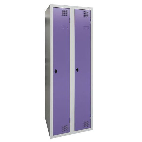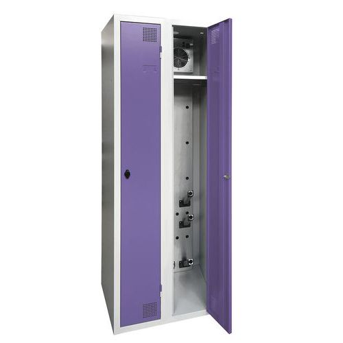 Cacifo com secagem com ar quente pulsado, de grande resistência, com compartimentos e cabides. Corpo e porta em chapa eletrozincada, com ómega de reforço a toda a altura. Utilização confortável com sistema de dobradiças que oferecem uma abertura a 180°. Higiénico, com dupla ventilação na frente, na parte superior e na parte inferior do cacifo. Acabamento elegante em tinta epóxi lacada, numa grande palete de cores atraentes. 2 fechos à escolha: fechadura com chave ou fecho porta-cadeado. Cacifo com porta-etiquetas. Produto fabricado em França.