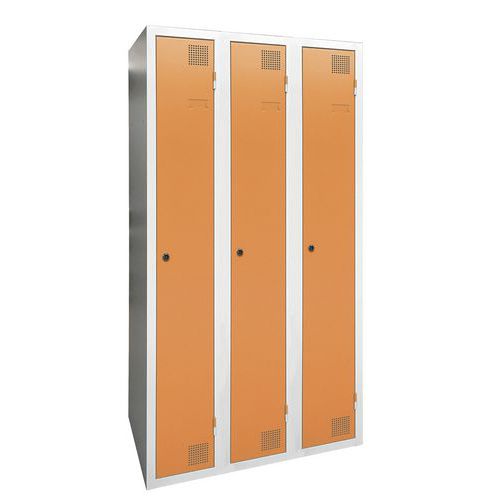 Cacifo com secagem com ar quente pulsado, de grande resistência, com compartimentos e cabides. Corpo e porta em chapa eletrozincada, com ómega de reforço a toda a altura. Utilização confortável com sistema de dobradiças que oferecem uma abertura a 180°. Higiénico, com dupla ventilação na frente, na parte superior e na parte inferior do cacifo. Acabamento elegante em tinta epóxi lacada, numa grande palete de cores atraentes. 2 fechos à escolha: fechadura com chave ou fecho porta-cadeado. Cacifo com porta-etiquetas. Produto fabricado em França.