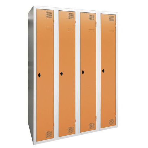 Cacifo com secagem com ar quente pulsado, de grande resistência, com compartimentos e cabides. Corpo e porta em chapa eletrozincada, com ómega de reforço a toda a altura. Utilização confortável com sistema de dobradiças que oferecem uma abertura a 180°. Higiénico, com dupla ventilação na frente, na parte superior e na parte inferior do cacifo. Acabamento elegante em tinta epóxi lacada, numa grande palete de cores atraentes. 2 fechos à escolha: fechadura com chave ou fecho porta-cadeado. Cacifo com porta-etiquetas. Produto fabricado em França.