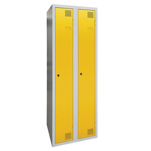 Cacifo com secagem com ar quente pulsado, de grande resistência, com compartimentos e cabides. Corpo e porta em chapa eletrozincada, com ómega de reforço a toda a altura. Utilização confortável com sistema de dobradiças que oferecem uma abertura a 180°. Higiénico, com dupla ventilação na frente, na parte superior e na parte inferior do cacifo. Acabamento elegante em tinta epóxi lacada, numa grande palete de cores atraentes. 2 fechos à escolha: fechadura com chave ou fecho porta-cadeado. Cacifo com porta-etiquetas. Produto fabricado em França.