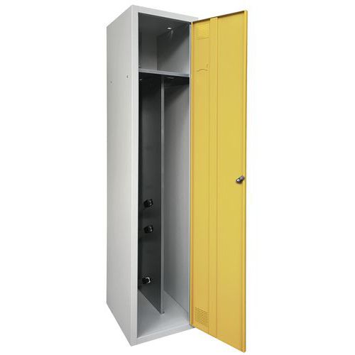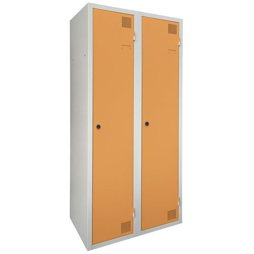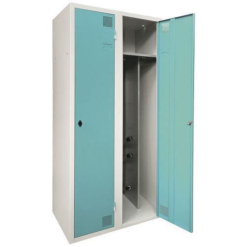 Cacifo com secagem com ar quente pulsado, muito robusto, com compartimentos e cabides duplos. Compartimento duplo com cabides: guarde o vestuário limpo/sujo em separado. Corpo e porta em chapa eletrozincada, com ómega de reforço a toda a altura. Utilização confortável com sistema de dobradiças que oferecem uma abertura a 180°. Higiénico, com dupla ventilação na frente, na parte superior e na parte inferior do cacifo. Acabamento elegante em tinta epóxi lacada, numa grande palete de cores atraentes. 2 fechos à escolha: fechadura com chave ou fecho porta-cadeado. Cacifo com porta-etiquetas. Produto fabricado em França.