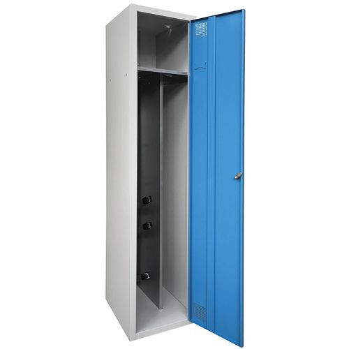 Cacifo com secagem com ar quente pulsado, muito robusto, com compartimentos e cabides duplos. Compartimento duplo com cabides: guarde o vestuário limpo/sujo em separado. Corpo e porta em chapa eletrozincada, com ómega de reforço a toda a altura. Utilização confortável com sistema de dobradiças que oferecem uma abertura a 180°. Higiénico, com dupla ventilação na frente, na parte superior e na parte inferior do cacifo. Acabamento elegante em tinta epóxi lacada, numa grande palete de cores atraentes. 2 fechos à escolha: fechadura com chave ou fecho porta-cadeado. Cacifo com porta-etiquetas. Produto fabricado em França.