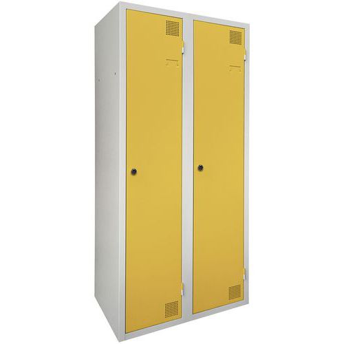 Cacifo com secagem com ar quente pulsado, muito robusto, com compartimentos e cabides duplos. Compartimento duplo com cabides: guarde o vestuário limpo/sujo em separado. Corpo e porta em chapa eletrozincada, com ómega de reforço a toda a altura. Utilização confortável com sistema de dobradiças que oferecem uma abertura a 180°. Higiénico, com dupla ventilação na frente, na parte superior e na parte inferior do cacifo. Acabamento elegante em tinta epóxi lacada, numa grande palete de cores atraentes. 2 fechos à escolha: fechadura com chave ou fecho porta-cadeado. Cacifo com porta-etiquetas. Produto fabricado em França.