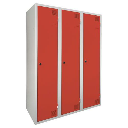 Cacifo com secagem com ar quente pulsado, muito robusto, com compartimentos e cabides duplos. Compartimento duplo com cabides: guarde o vestuário limpo/sujo em separado. Corpo e porta em chapa eletrozincada, com ómega de reforço a toda a altura. Utilização confortável com sistema de dobradiças que oferecem uma abertura a 180°. Higiénico, com dupla ventilação na frente, na parte superior e na parte inferior do cacifo. Acabamento elegante em tinta epóxi lacada, numa grande palete de cores atraentes. 2 fechos à escolha: fechadura com chave ou fecho porta-cadeado. Cacifo com porta-etiquetas. Produto fabricado em França.