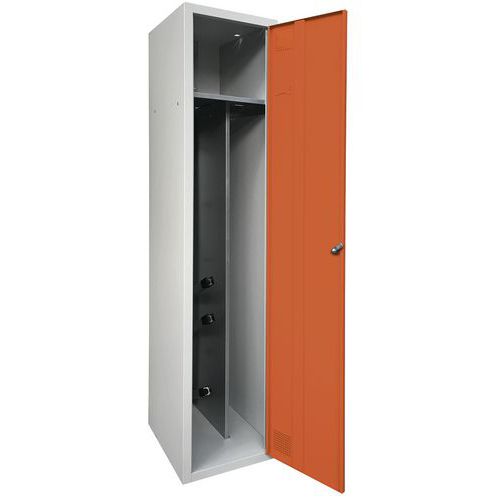Cacifo com secagem com ar quente pulsado, muito robusto, com compartimentos e cabides duplos. Compartimento duplo com cabides: guarde o vestuário limpo/sujo em separado. Corpo e porta em chapa eletrozincada, com ómega de reforço a toda a altura. Utilização confortável com sistema de dobradiças que oferecem uma abertura a 180°. Higiénico, com dupla ventilação na frente, na parte superior e na parte inferior do cacifo. Acabamento elegante em tinta epóxi lacada, numa grande palete de cores atraentes. 2 fechos à escolha: fechadura com chave ou fecho porta-cadeado. Cacifo com porta-etiquetas. Produto fabricado em França.