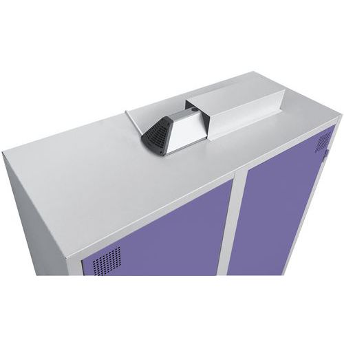 Cacifo de desinfeção rápida, eficaz e económica com tecnologia de ozono. Prateleira com perfurações grandes para a livre circulação e a boa ventilação do ozono. Cacifo com resguardo de proteção, bem como indicador de funcionamento Air Care. Produto concebido e fabricado em França. Solução de ozono: desinfeção total de vestuário e ferramentas em tempo recorde!