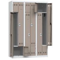 Cacifo economizador de espaço em L com 1 a 3 colunas. Permite que cada utilizador tenha acesso a um compartimento de arrumação e um guarda-roupa. O espaço de arrumação útil corresponde à capacidade máxima dos compartimentos, podendo ser totalmente utilizado. Recomendações de segurança: - Instalar o móvel numa superfície plana - Fixá-lo numa parede ou divisória, com uma fixação adequada - Ter atenção para não ultrapassar a carga máxima recomendada, assim como a distribuição correta