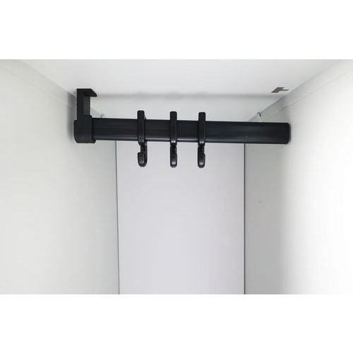 Prateleira superior equipada com 1 vareta com 2 ganchos e porta-cabides na parte inferior.