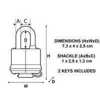 | Nome do artigo | Cadeado com chave em aço laminado 312EURD – Master Lock, Cores: Azul, Comp.: 25 mm, Argola Ø: 10 mm |
