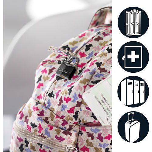 | Nome do artigo | Cadeado com chaves em alumínio maciço, Cores: Preto, N.º de chaves: 2, Argola Ø: 3 mm, Altura: 1.1 cm |