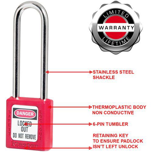 - Cadeado de segurança em termoplástico e asa alta em aço com Ø 6 mm para instalações mecânicas.