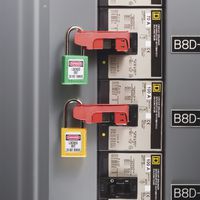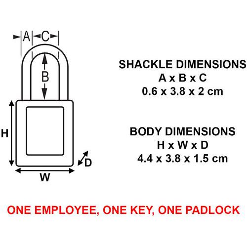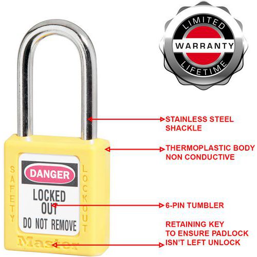 - Cadeado de segurança em termoplástico e asa em aço com Ø 6 mm para instalações mecânicas.