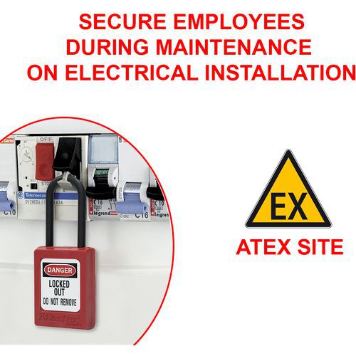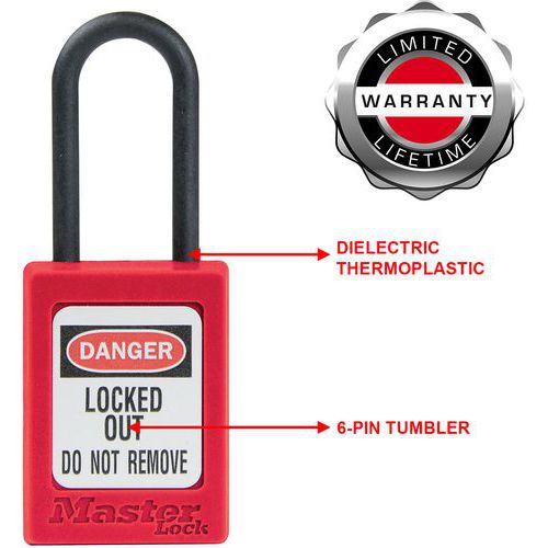 Cadeado de segurança em termoplástico e asa em nylon dielétrico com 4,76 mm de diâmetro para instalações elétricas. Adequado para locais e áreas classificados pela ATEX. Sem retenção da chave. Asa fina para mais aplicações de segurança. Considere o serviço LIFEGUARD: serviço gratuito de registo dos números de chaves utilizadas por uma empresa para garantir que as chaves não são duplicadas nas suas equipas! Indicar esta opção quando efetuar a encomenda.