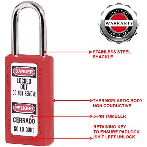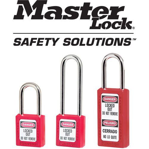 - Cadeado de segurança corpo alto (para etiquetas bilingues) em termoplástico e asa em aço para instalações mecânicas.