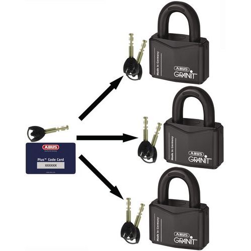 Cadeado fornecido com 2 chaves individuais. Este cadeado tem ser encomendado obrigatoriamente com a chave-mestra para cadeados Granit das séries 37 e 88. Para encomendar posteriormente uma chave-mestra adicional, é necessário indicar o número da chave-mestra já na posse do cliente (7 dígitos).