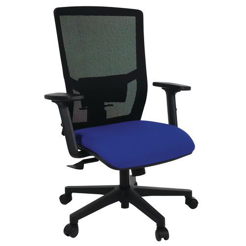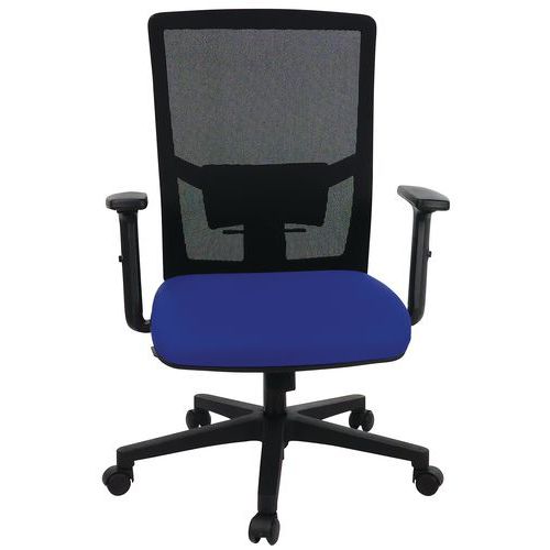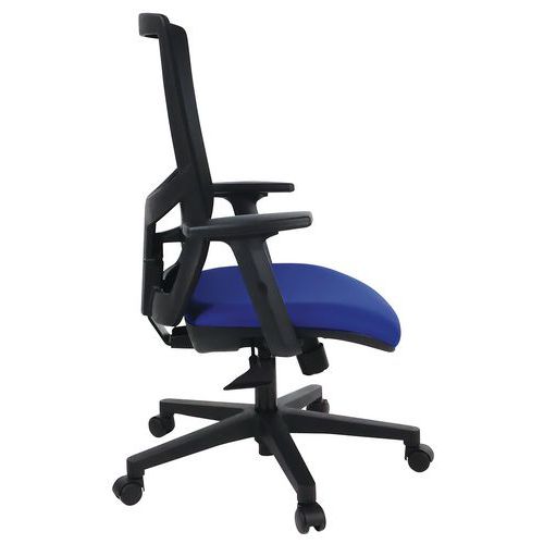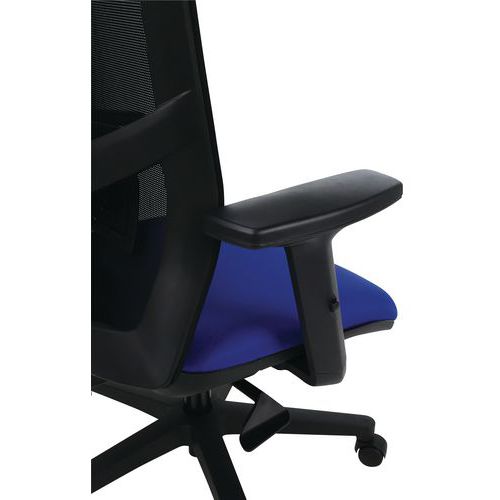 Cadeira de escritório com apoio para os braços 3D e uma orientação em altura, largura e profundidade. Espaldar antitranspirante em rede. Assento em tecido confortável. Mecanismo síncrono.