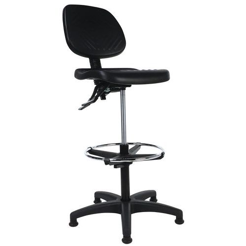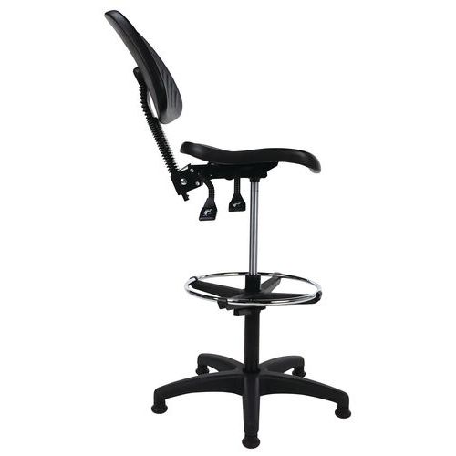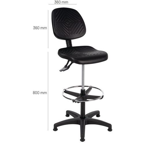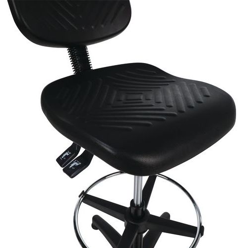 Cadeira de oficina Techno de elevado conforto graças à altura do espaldar. Possibilidade de regular o apoio para os pés para garantir uma posição sentada confortável. Altura do assento regulável para proporcionar maior conforto. Fabricado na UE
