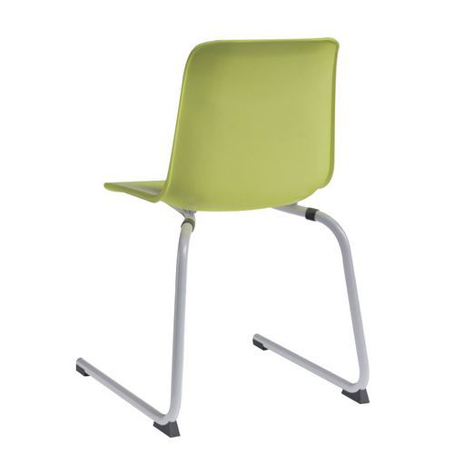 Cadeira com dois pés em L. Pés estáveis com suporte de pé. Espaldar confortável.