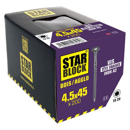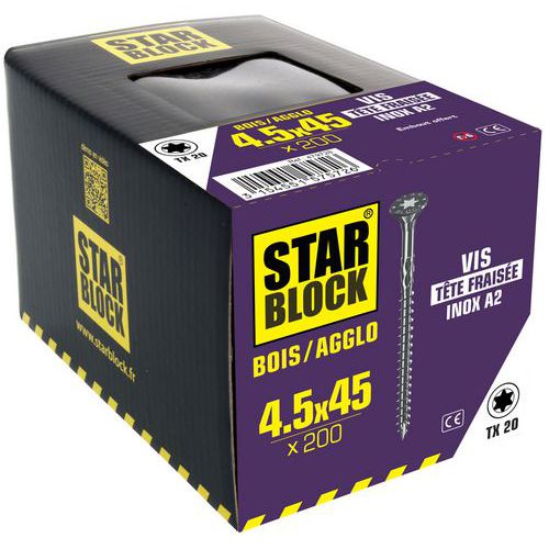 | Nome do artigo | Caixa de 200 parafusos Torx 4,5 x 45 mm – Starblock, Material: Inox, Roscagem Ø: 4.5 mm |