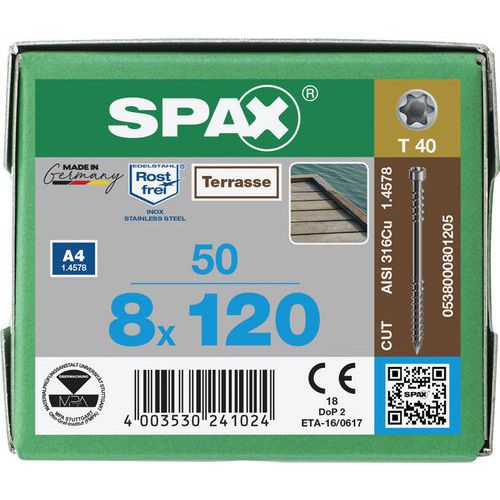 | Nome do artigo | Caixa de 50 parafusos de cabeça cilíndrica para deck TX Ø 8 mm, Material: Aço, Roscagem Ø: 8 mm |
