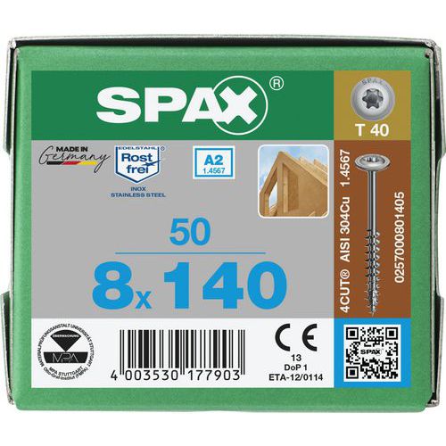 Caixa de 50 parafusos de cabeça em disco para madeira TX e rosca completa Ø 8 mm- Spax, Material: Aço
