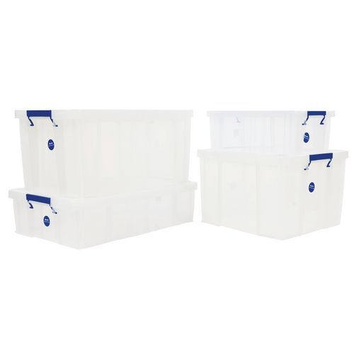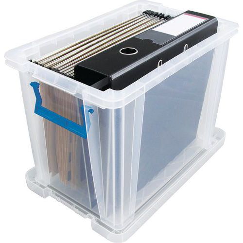 Caixa de arrumação robusta e extremamente estável. Prática: o transporte é simplificado graças às pegas. Identificação rápida dos objetos no interior da caixa graças à construção transparente.