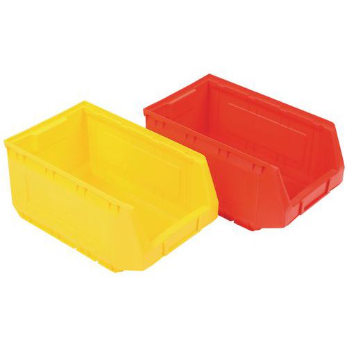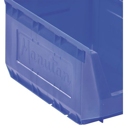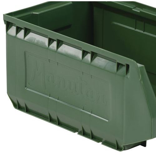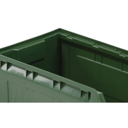 Rebordos com apoios de bloqueio para uma maior estabilidade no empilhamento. Grande robustez graças às suas nervuras laterais. Fundo plano e antiderrapante para uma preensão fácil. Excelente preensão graças às pegas dianteira e traseira. Boa resistência aos choques. Identificação fácil através de porta-etiqueta. Fabricado na UE