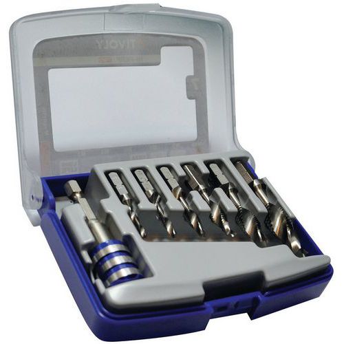 | Nome do artigo | Caixa de brocas HSS Quick Change – Tivoly, N.º de peças: 7, Material: Aço, Tipo de soporte: Plástico |