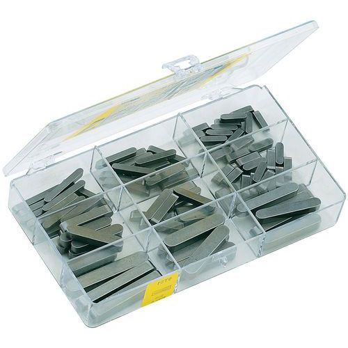 | Nome do artigo | Caixa de chavetas paralelas sortidas, N.º de peças: 90, Material: Aço, N.º de compart.: 9, Modelo: Paralela |