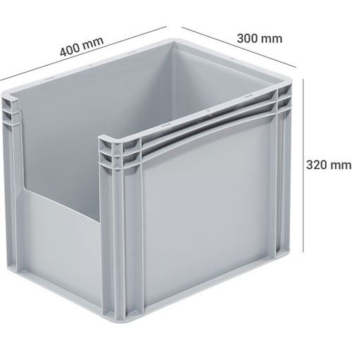| Nome do artigo | Caixa de norma europeia com abertura frontal – Comprimento de 400 mm – 21 L, Capacidade: 30 L |
