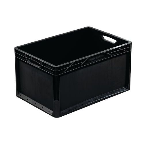 A caixa de norma europeia de abertura frontal é estável graças à sua construção de parede dupla. Prática, graças às pegas ergonómicas. Adequada para a movimentação manual e o transporte automático de mercadorias leves. Fácil de limpar, graças aos orifícios de evacuação de água.