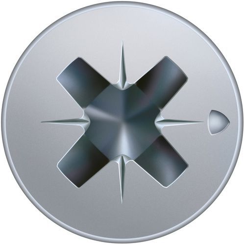 A cabeça escareada abre um caminho através da madeira com a sua parte inferior poligonal e pode, por isso, ser introduzida sem perfuração prévia. A forma quadrada da ponta empurra as fibras da madeira para fora do caminho ao aparafusar e cria espaço para o diâmetro do corpo do parafuso. O recesso transversal em Z aumenta a estabilidade lateral da ponta e reduz o efeito de deslizamento. A rosca completa estende-se ao longo de todo o comprimento do parafuso. Proteção contra a corrosão.