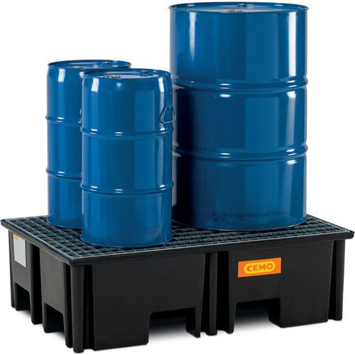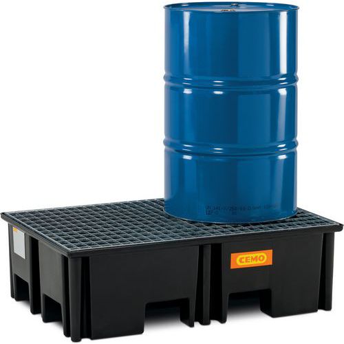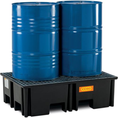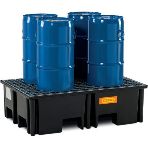 Caixa de retenção ideal para o armazenamento de paletes com bidões. Permite a retenção de derrames de materiais perigosos ou durante o enchimento do bidão.