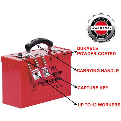 | Nome do artigo | Caixa de segurança de grupo n.º 498, Largura: 95 mm, Comp.: 235 mm, Cores: Vermelho, Material: Aço |