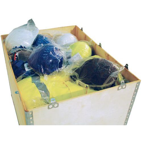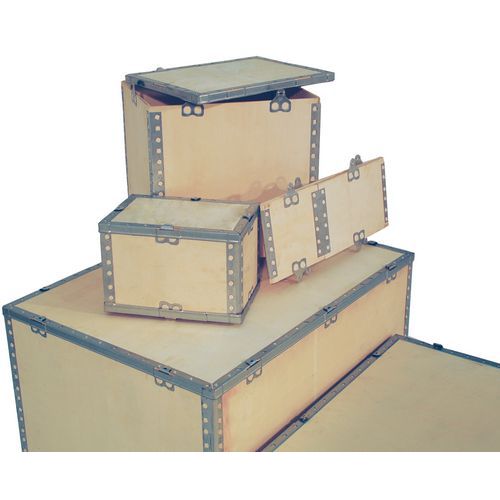 Caixa de transporte em contraplacado para exportação com proteção de canto em aço zincado. Excelente resistência às agressões de natureza mecânica e climática. Montagem, desmontagem e dobragem fáceis com uma simples chave de parafusos. Caixa selável e personalizável por marcação e etiquetagem. Espessura do contraplacado da caixa: 5,5 mm.
