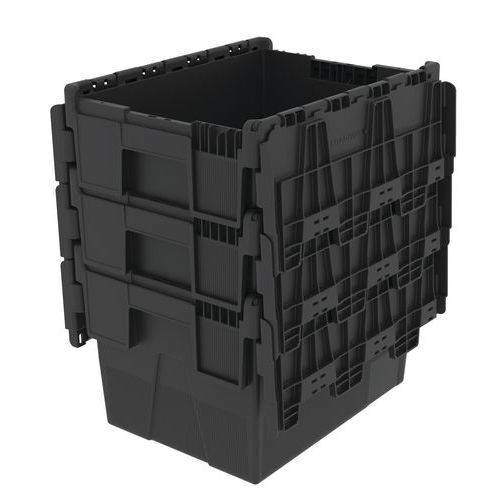 A caixa de transporte em plástico reciclado é perfeita, uma vez que é empilhável e encaixável, permitindo uma poupança de espaço significativa. Caixa de norma europeia paletizável que oferece uma grande estabilidade no empilhamento. Resistente às diferentes variações de temperatura. Prática: a tampa é amovível e rebatível. Fecho inviolável graças às abraçadeiras.