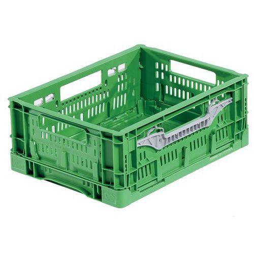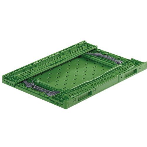Caixa dobrável prática, pois permite reduzir o volume. Construção especial do fundo e dos cantos para suportar cargas pesadas ao empilhar. Fácil de dobrar e desdobrar, graças ao fecho ergonómico Lift-Lock. Superfícies especialmente lisas para proteger a mercadoria. Perfuração ideal para fornecer ventilação aos diversos produtos. Estável e muito fácil de empilhar.