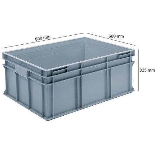 | Nome do artigo | Caixa empilhável cinzenta de norma europeia RAKO – 90 a 175 L, Capacidade: 134 L, Empilhável: sim |