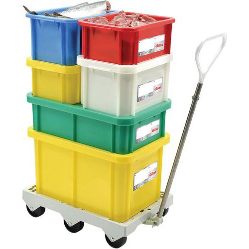 Caixa empilhável com tampa em conformidade com o procedimento HACCP relativo à conservação dos produtos alimentares. Marcação fiável e facilmente apagável graças à sua etiqueta IML integrada. Pegas recuadas para melhor manuseamento. Empilhável sem tampa. Design sem nenhuma zona de retenção. Lavável à máquina. Compatível com todas as bases de 4 e 6 rodas Gilac.