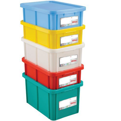 Caixa empilhável com tampa em conformidade com o procedimento HACCP relativo à conservação dos produtos alimentares. Marcação fiável e facilmente apagável graças à sua etiqueta IML integrada. Pegas recuadas para melhor manuseamento. Empilhável sem tampa. Design sem nenhuma zona de retenção. Lavável à máquina. Compatível com todas as bases de 4 e 6 rodas Gilac.