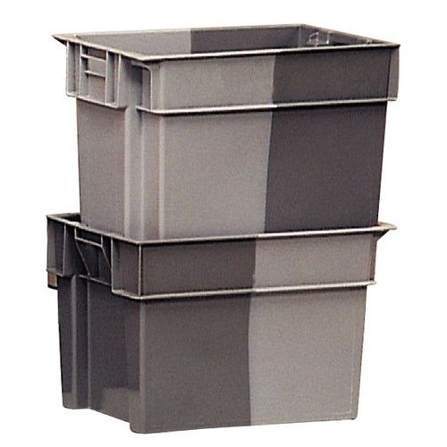 Encaixável a 60% para uma economia de espaço em vazio. Manuseamento confortável através das suas largas pegas ergonómicas. Compatível com qualquer tipo de transportador graças ao seu fundo liso. Posições de empilhamento/encaixe facilmente identificáveis por estrutura bicolor.
