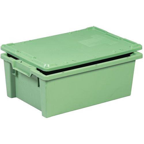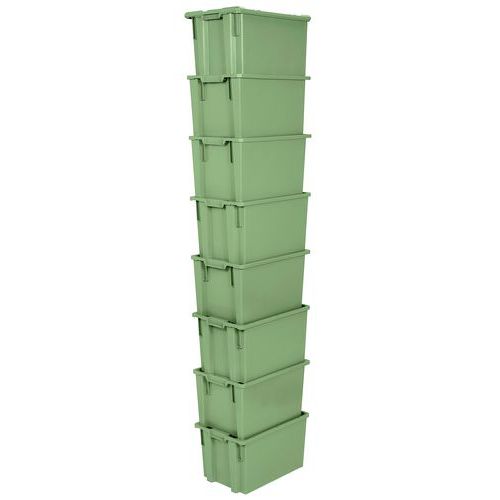 Empilhável ou encaixável através de simples basculamento graças à sua estrutura assimétrica. Economia de espaço no encaixe de 65%. Fundo plano para compatibilidade com transportadores automáticos. Caixa empilhável compatível com a indústria alimentar. Disponível em 5 modelos.