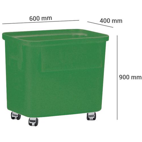 Deslocamento facilitado através de rodízios. Fácil de identificar graças às suas diferentes cores. Ampla área de marcação para uma identificação directa na caixa. Fecho garantido por uma tampa encaixada. Facilidade de limpeza e esvaziamento.