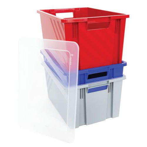 Caixa encaixável equipada com pegas abertas para facilitar a deslocação.