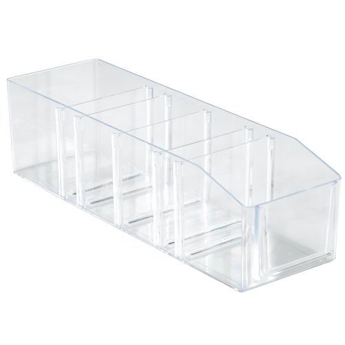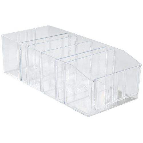 Caixa-gaveta robusta. Caixa-gaveta compartimentável. Abertura na frente para uma melhor visualização do conteúdo. Paredes e fundo lisos. Boa resistência aos ácidos.