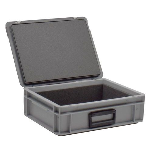 Caixa-maleta com tampa e dobradiças com 2 reforços. Bloqueável com 2 fechos com mola. Empilhável sem risco de deslizamento. As paredes lisas garantem uma limpeza perfeita. Maleta de plástico com pega de transporte do lado comprido. Porta-etiquetas injetados, 1 no lado maior e 1 no lado mais pequeno.
