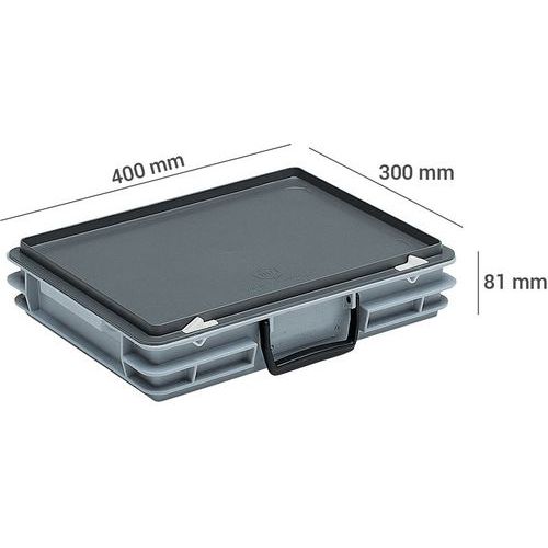 Caixa-maleta com tampa e dobradiças com 2 reforços. Bloqueável com 2 fechos salientes. Empilhável sem risco de deslizamento. As paredes lisas garantem uma limpeza perfeita. Maleta de plástico com pega de transporte do lado comprido.
